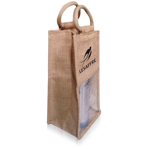 Keep your company name and logo fresh in your customer’s memories with a Natural One Bottle Jute Bag. Its features includes wooden cane handles, bio-degradable, natural wide wave and is used for carrying bottle will ensure repeat business.